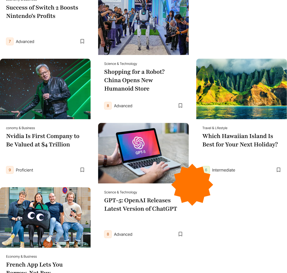 By studying news materials updated daily, you can confidently speak about a variety of relevant business topics.